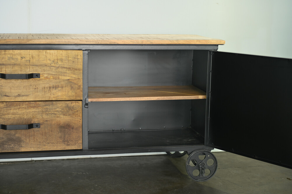metaal zwart op wieltjes industrieel tv meubel in metaal en mango hout, holland modern