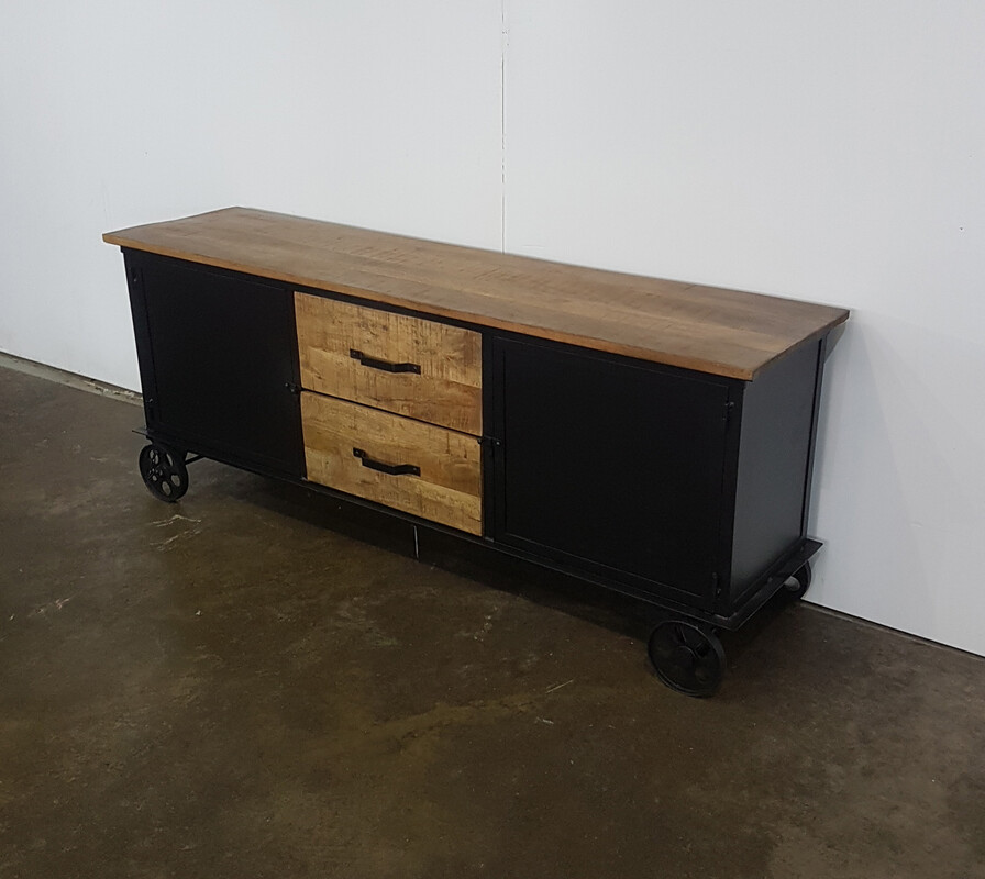 metaal zwart op wieltjes industrieel tv meubel in metaal en mango hout, modern, in nieuw staat, te koop in industriële meubels | Teak Paleis