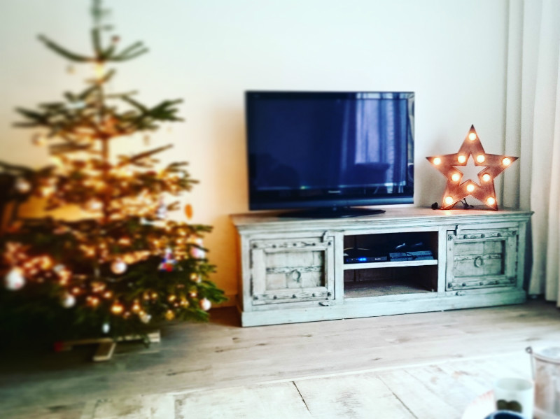 Brocante tv meubel in indisch stijl. Het vintage tv kastje is 180 cm breed en heeft 2 mooie dikke deuren.