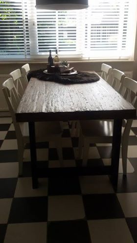 Rustieke tafel met metalen poten. Het blad heeft een mooi en ruw uiterlijk.