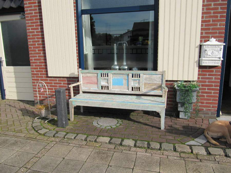 Mooie gekleurde brocante bank , leuk voor buiten maar ook ruig voor binnen