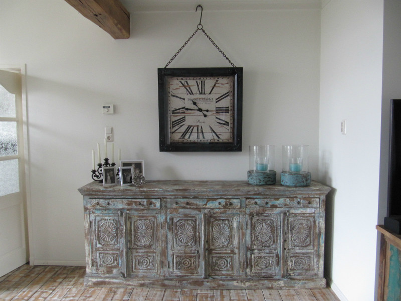 Brocante dressoir met 4 deuren en vier laden. De panelen van de deuren zijn met mooie ornementen bestoken.
