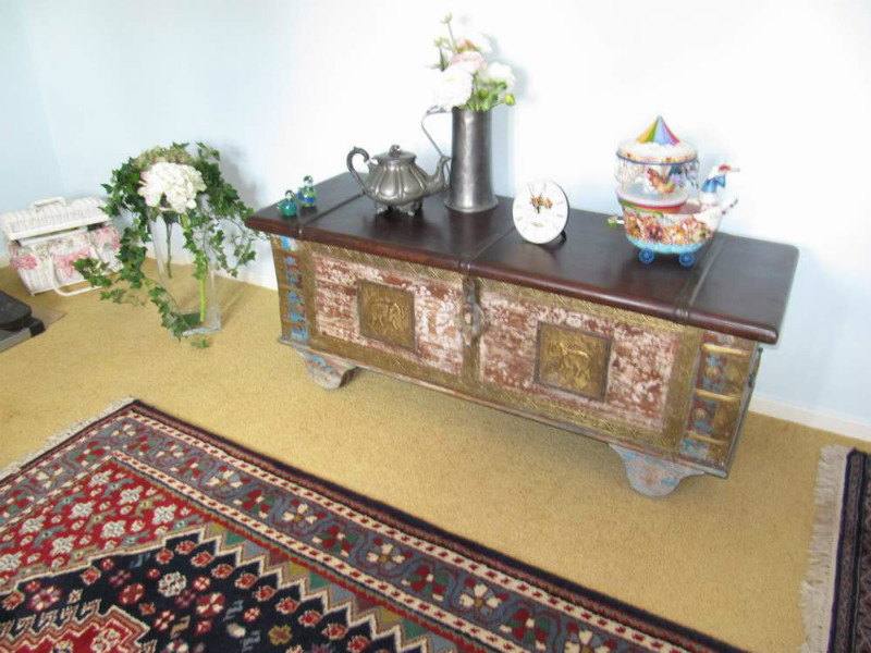 Leuk brocante kist die een kleurrijk en rustig interieur heeft gecreërd.