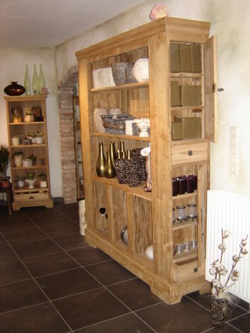 Teakhouten boekenkasten die bij een bloemisterij staat. De rustieke uitstraling van deze robuuste kasten komt sterk naar voren. Ook zijn ze prachitg te combineren.