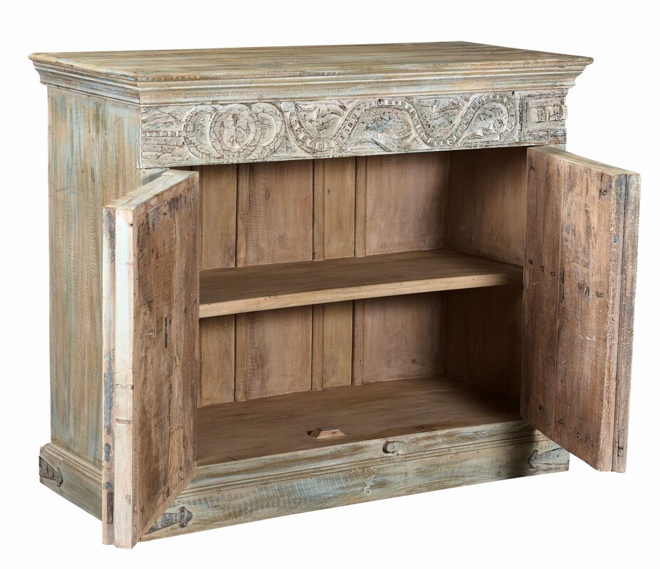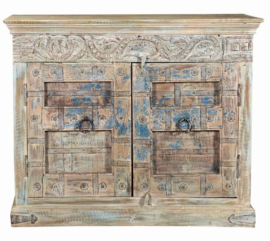 Vintage white wash commode met 2 deuren in sloophout, brocante, in prima staat, te koop in Indiase meubelen | Teak Paleis